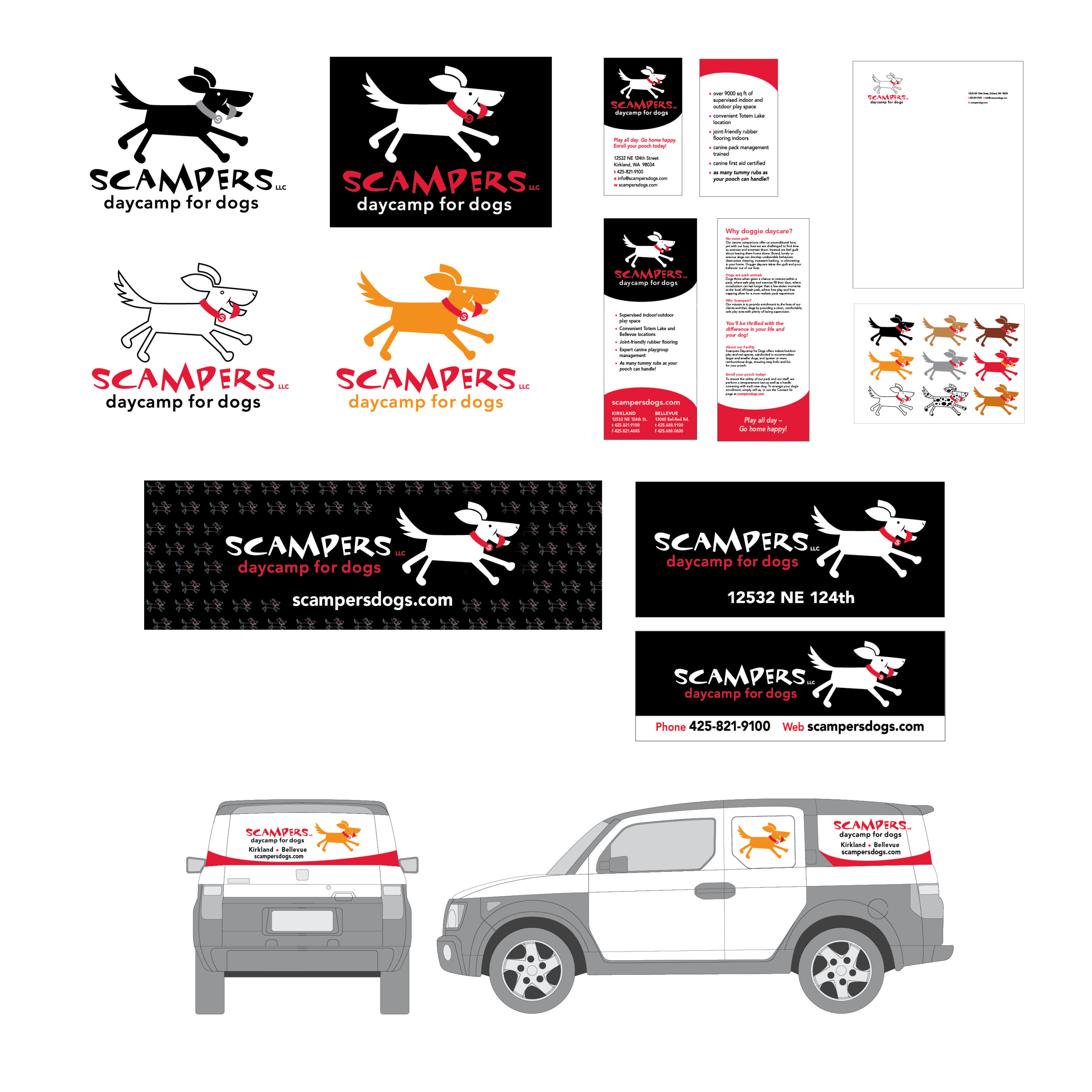 To design a fun logo and brand for this doggy daycare, including a logo, business card, promotional card, car and location signage, and banners and a window cling.
