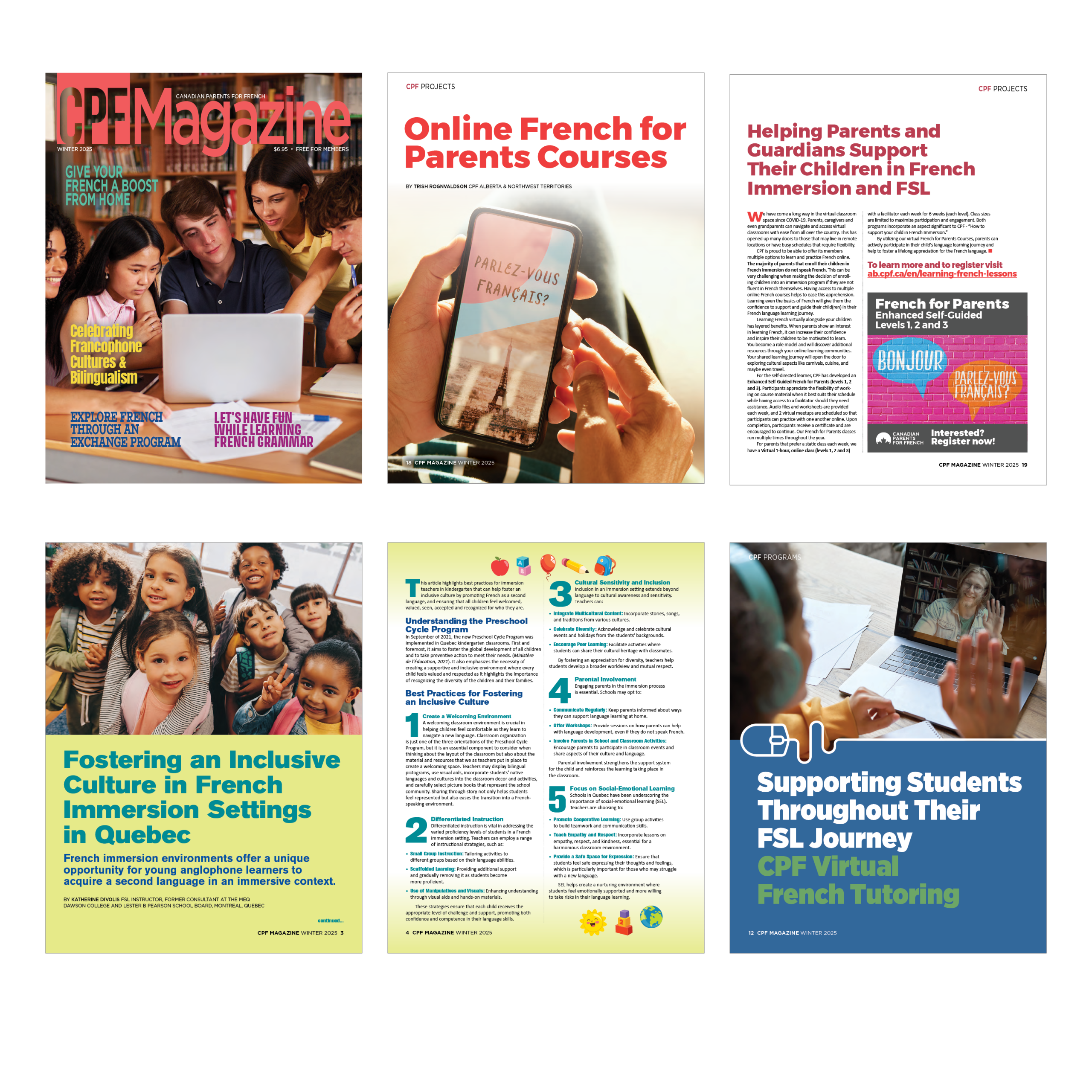 A quarterly magazine designed and produced for Canadian Parents for French members and stakeholders that is distributed as an e-magazine and in print format.